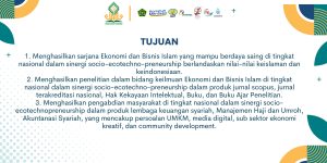 4. Peningkatan mutu pengabdian masyarakat dalam sinergi socio-ecotechno- preneurship dalam produk perbankan syariah, Manajemen Haji dan Umroh, Akuntansi Syariah, dan Ekonomi Syariah.